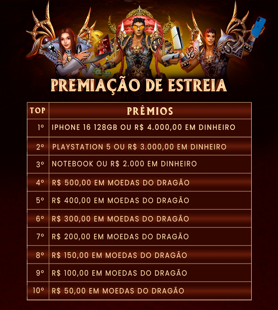 O grande momento se aproxima! Para celebrar a inauguração oficial do Therea2, preparamos um evento histórico: a Premiação de Estreia. Os 10 primeiros jogadores a atingirem o nível máximo no servidor serão recompensados com prêmios incríveis e exclusivos!